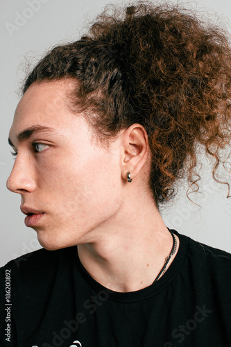 Download Musicians With Long Curly Hair PNG. Portraits of a guy with an attractive appearance, curly hair and stylish clothes. The image is available for download in high resolution quality up to 3456x5184.